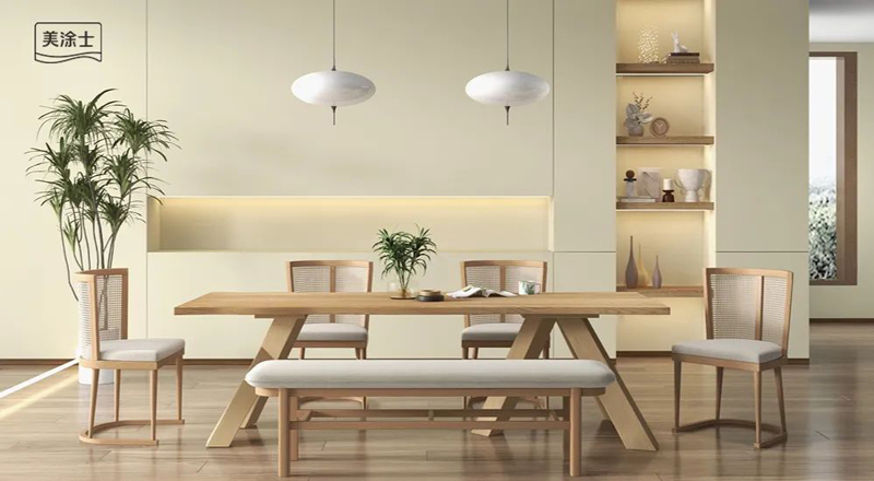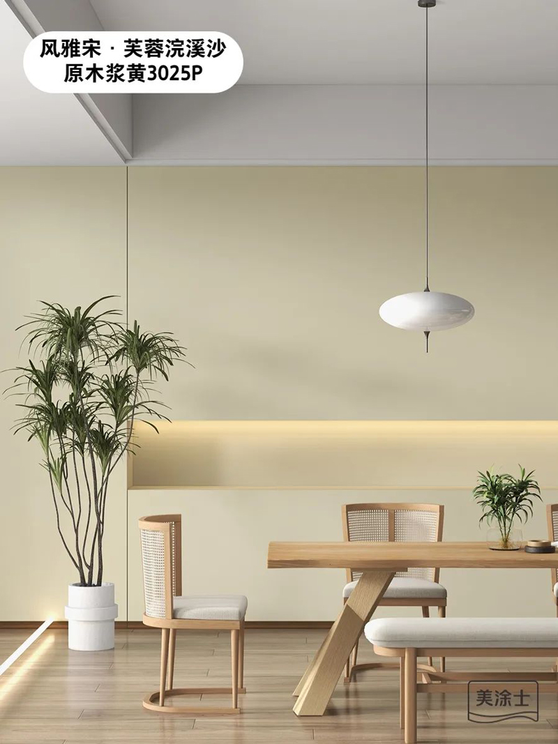 美涂士國潮色原木漿黃3025P,搭配木質家具和素色裝潢,在大量鋪設的淺色元素中,人的視野也似乎被擴大,空間與自然融為一體。在極簡的家居布置中,即便沒有艷麗的色彩點綴,原木漿黃也能打造出和諧舒適的氛圍而不乏味。
