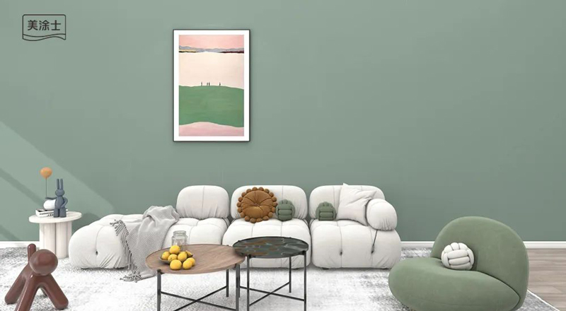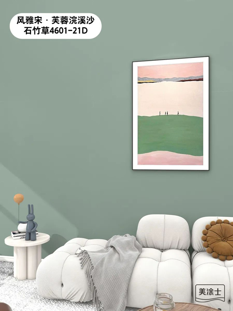 美涂士國潮色石竹草4601-21D,便融入了自然的色彩,利用白色軟裝及地毯,搭配色澤飽滿的是石竹綠色,自然的森系氣息包裹著空間,只一眼,便足以令人心神松弛,感受到空間中的溫馨舒適感。