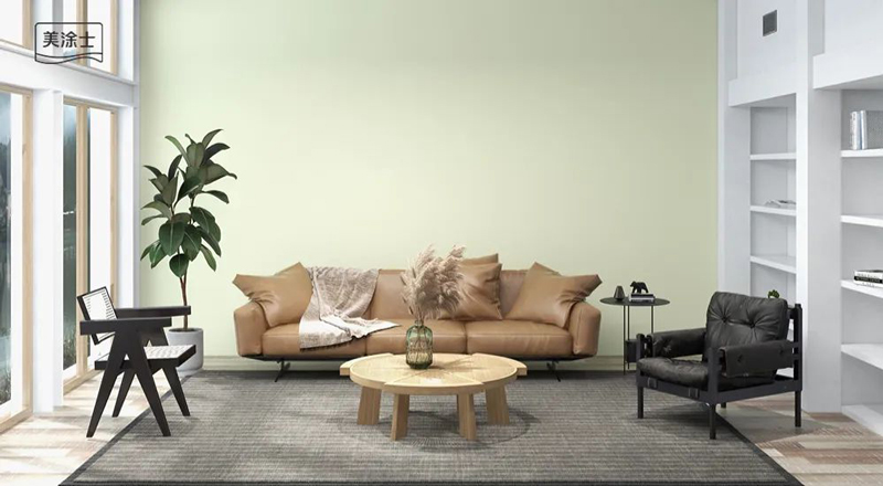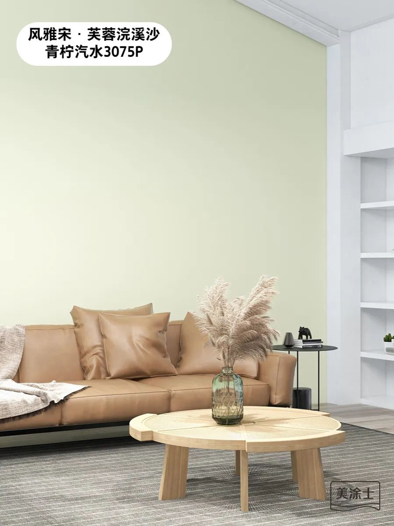 美涂士國潮色青檸汽水3075P,這種淡淡的綠黃調鋪滿整個客廳背面,不僅點亮了整個空間,且不會凸顯陳舊感。與素色裝潢自然搭配,在空間中散發(fā)著明媚和活力的氣息,裝上大面積落地窗戶,還能與外面觀景巧妙融合。