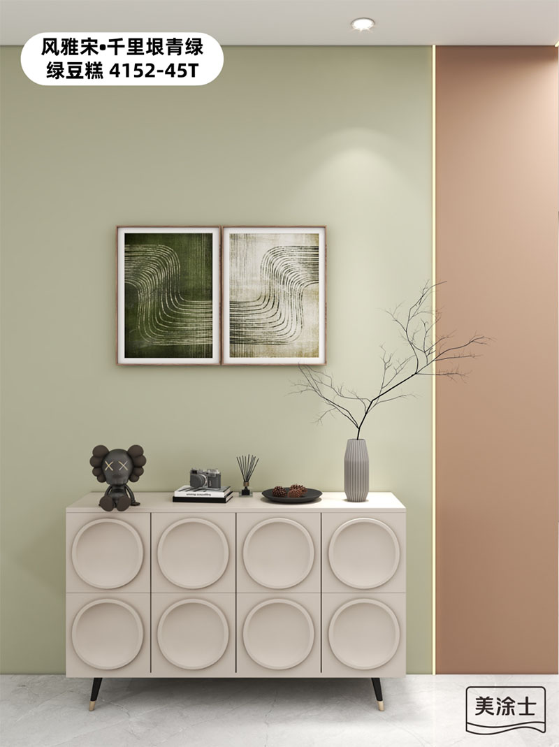 美涂士國潮色草木知春3102T,弱化了復(fù)古綠的陳舊感,強(qiáng)化了空間的時(shí)髦感,與灰白軟裝的搭配,一明一暗的對比,一冷一暖的融合,奢華的質(zhì)感與復(fù)古的氣息碰撞,勾勒出低調(diào)的高級(jí)時(shí)尚感,讓空間的氣場和顏值達(dá)到峰值。